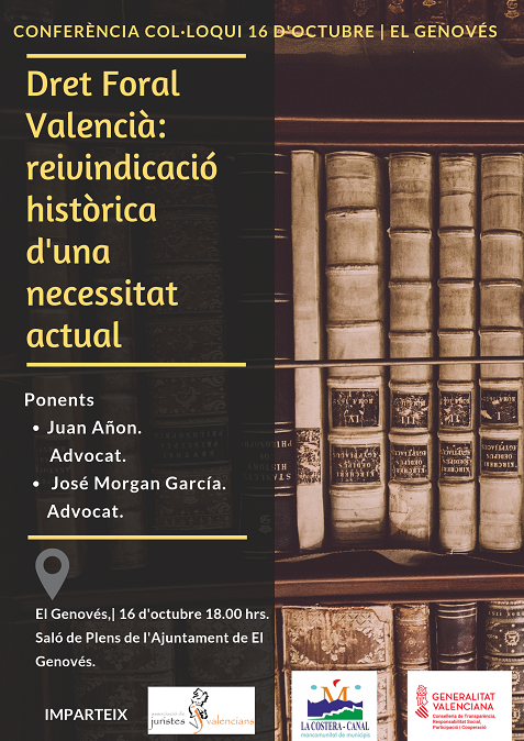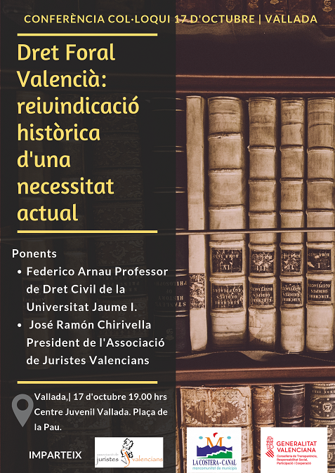 Els pròxims dies 16 i 17 d'octubre se celebraran taules col·loqui sobre el Dret Foral Valencià. Estos són els dos actes: