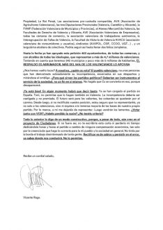 También la Federación Valenciana de Municipios y Provincias, el Ateneo Mercantil de Valencia, las Facultades de Derecho de Valencia y Alicante, la Asociación Valenciana de Empresarios, todas las cámaras de comercio, la asociación valenciana de trabajadores autónomos, la Interagrupación de Fallas de Valencia, la Facultad de Historia de Valencia, AVACU, sindicatos (AVAPOL, CSIF, CCOO, UGT…) “y un larguísimo etcétera de colectivos. Podría seguir así hasta llenar dos folios completos”, concluye Raga.